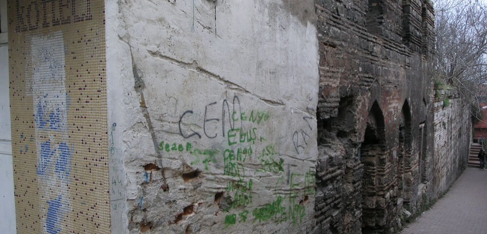 fotoğraf: çağa sokak (haydar caddesi) mini kalebodur, sur kalıntısı, beton, duvar yazısı, hepsi kiralık